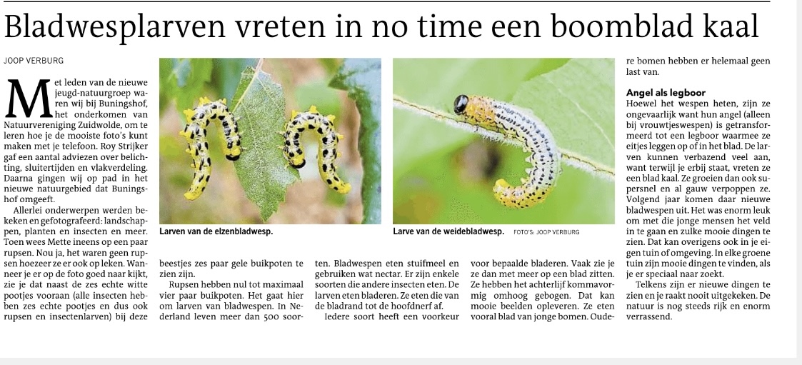 Naar aanleiding van de excursie Natuurfotografie van de JeugdgroepVO van 27 september schreef Joop een artikel voor Groen&Doen van de Hoogeveensche Courant van 10 oktober over Bladwespen.