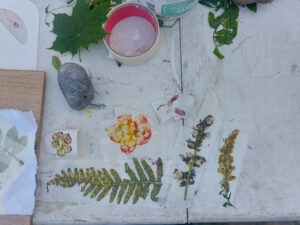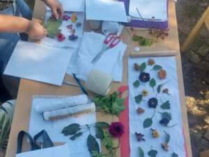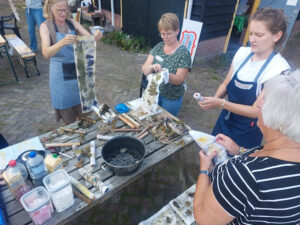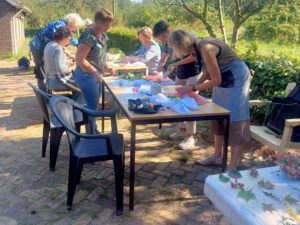 Op de zonnige dag van 21 september verzamelden we ons op Buningshof van de natuurvereniging voor de workshop eco-printen. Na een korte uitleg over verschillende technieken mochten we zelf experimenteren. Verschillende bloemen en bladeren werden op de meest creatieve manieren op geprepareerde lappen stof gelegd, waarna de lappen strak werden opgerold en gestoomd in grote pannen. Ook was er ruimte verschillende prints uit te proberen met bijvoorbeeld ijzerwater, wat de print over het algemeen donkerder maakt, of aquarelpapier, wat als tussenlaag minder laat doordrukken. Na een kop thee in het herfstzonnetje, leefden we ons uit in een andere eco-print techniek plant-hammering waarbij we de bloemen en planten op de stoffen of aquarelpapier hamerden met stenen. Een bijzonder proces waarin ik me verbaasde over de intensiheid van de kleuren om ons heen.