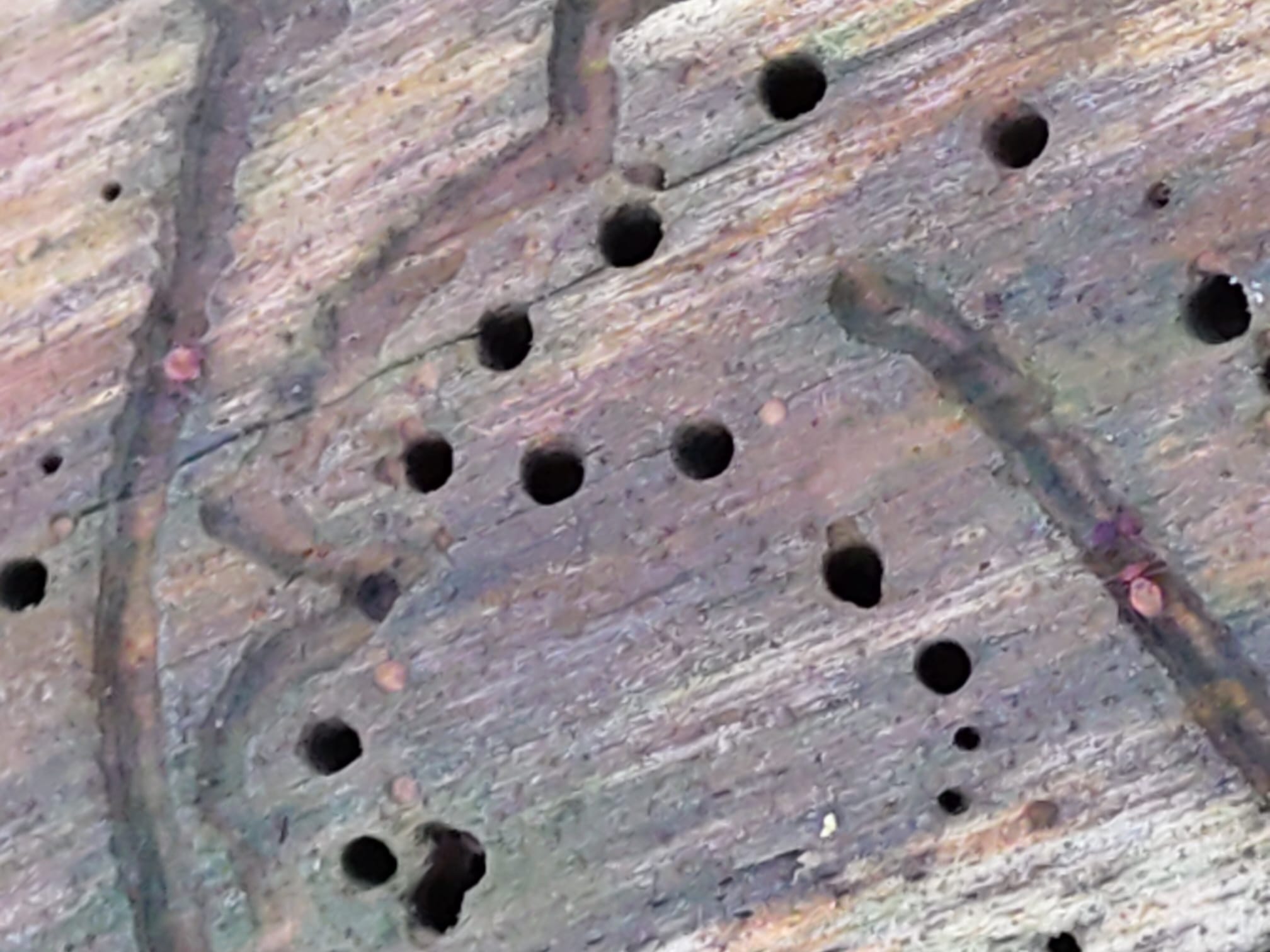 Op mijn rondje door het Ekelenbergbos kwam ik een omgevallen dennenboom tegen, reeds van zijn schors ontdaan, met een prachtig patroon op zijn kale huid van gangen en aan weerszijden daarvan gaten. Van iets wat mooi is, maak ik graag een foto. Maar ik vroeg mij ook nieuwsgierig af wie de kunstenaar geweest kon zijn. De app Obsidentify beweerde dat het hier 100% een Zwamneusje betrof, een heel zeldzaam microvlindertje. Maar toen ik dit thuis op zocht, leek mij het sterk: het Zwamneusje legt eitjes in een (hout)zwam en het rupsje maakt er gangetjes doorheen. Maar het waagt zich niet aan de schors van een boom. Dus ik vroeg Joop om raad. Hij kwam na enig zoeken met de oplossing: de Kleine dennenscheerder!
