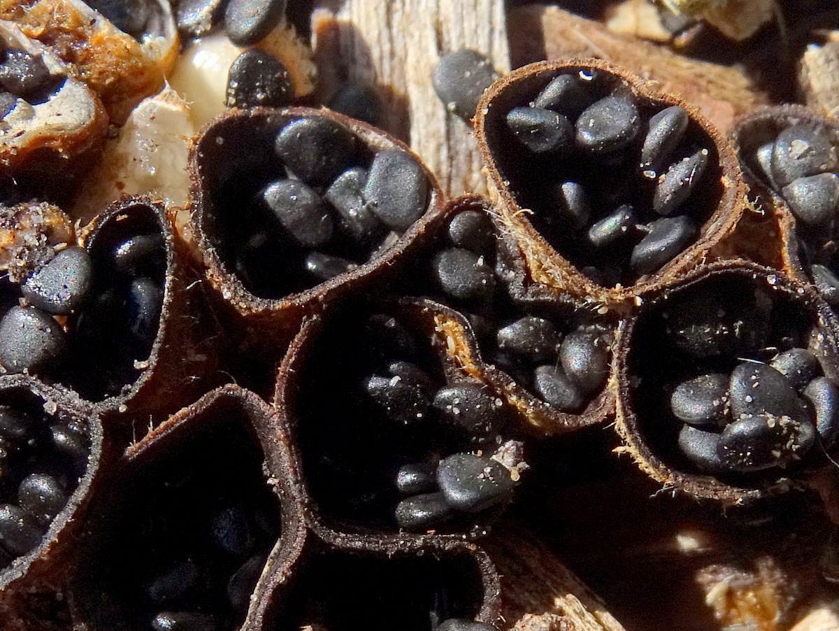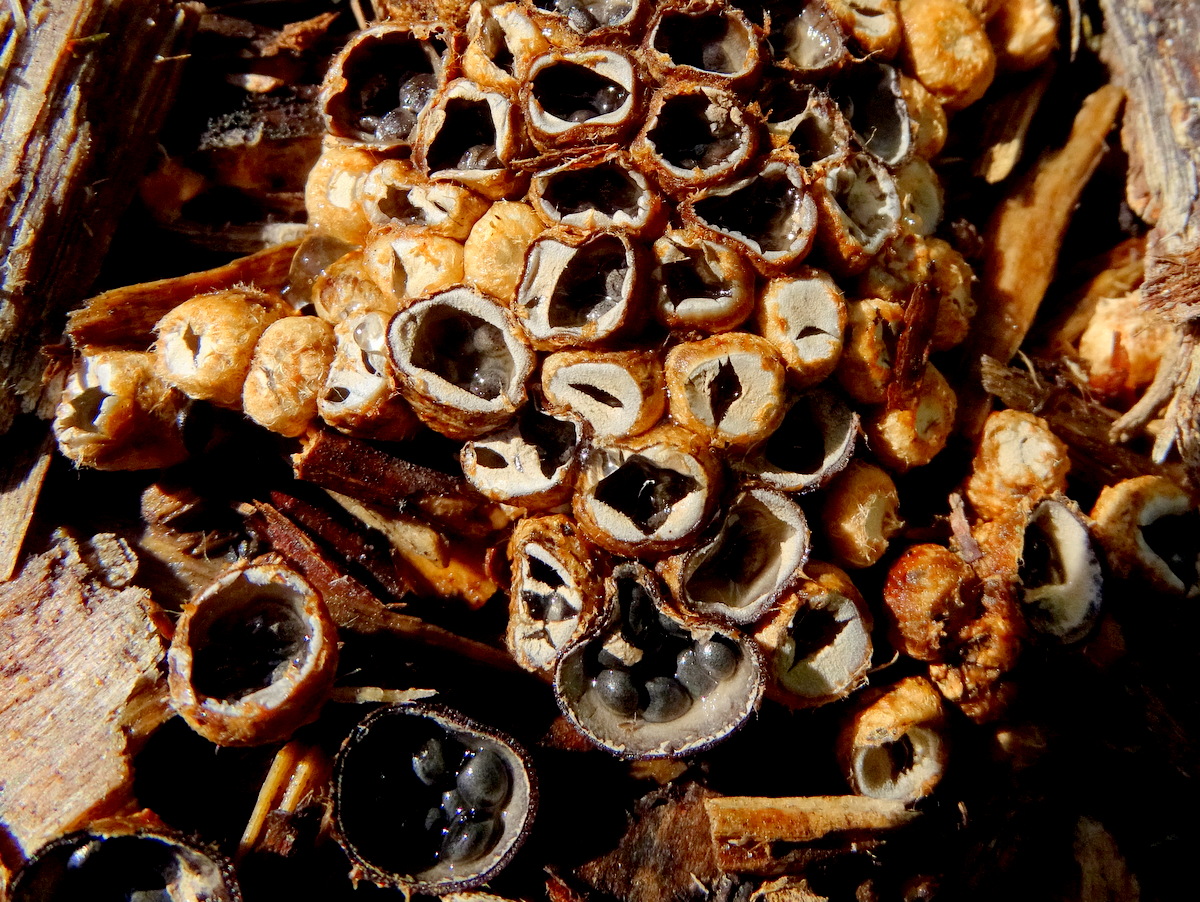 Eind september 2025 vond ik in een van de volkstuinen van Zuidwolde op een houtsnipperpad honderden kleine paddenstoeltjes. Het was direct duidelijk dat het ging om een soort nestzwammetje vanwege de aanwezigheid van sporendoosjes die leken op eitjes in een vogelnestje. Opvallend was dat de sporendoosjes vanaf het begin van het opengaan van het beschermend vliesje, glanzend pikzwart waren. Dat is heel anders dan de twee soorten nestzwammen die ik ken. Na wat zoekwerk bleek het te gaan om het Mestnestzwammetje dat dikwijls op houtsnippers voorkomt, Maar… in Drenthe zijn alleen lang geleden een paar meldingen geweest maar de laatste 35 jaar is deze soort niet in Drenthe gemeld. De verspreiding van sporen van nestzwammetjes vindt plaats doordat regendruppels in het “nestje” terecht komen en dat dan de sporendoosjes weggeslingerd worden.